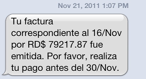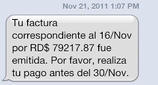 Llega el 16 de noviembre, día de corte de mi factura. Ya algunos habrán visto que tuitié un screenshot del SMS que me mandaron: la factura fue emitida por la suma de RD$79,217.89 --así mismito, SETENTA Y NUEVE MIL Y PICO DE PESOS.