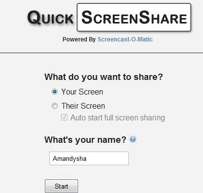 Sólo debemos acceder a http://quickscreenshare.com desde cualquier computador con sistema operativo Linux, Windows o Mac (es obligatorio que pueda correr java), indicar el nombre que vamos a usar y si nosotros accederemos al computador de la otra persona o si es la otra persona quién accederá al nuestro. Luego pulsamos "Start" y en seguida se nos generará un enlace que debemos facilitar a la otra persona para que acceda a él, ¡listo! Cuando la otra persona acceda a dicho enlace empezaremos a establecer una conexión P2P para visualizar la pantalla del computador remotamente y controlar su teclado y mouse.