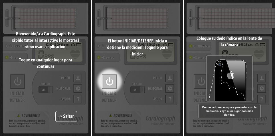 Cardiograph me sentí ante un verdadero electrocardiograma. Durante el proceso se muestran los latidos de nuestro corazón en tiempo real, así como una gráfica de la frecuencia acompañada de sonidos muy parecidos a los de un verdadero