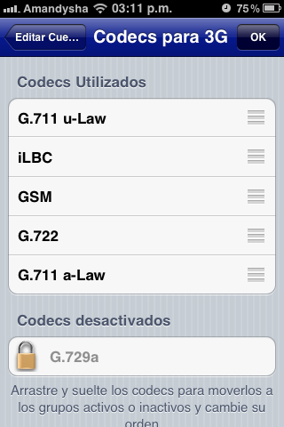 Yo recomiendo usar el codec G.711 o el G.729 que es el mejor de todos aunque tendríamos que pagar adicional en InApp Purchase por él. Aun así podemos escoger entre varios tipos de codec que nos garantizarán una calidad fenomenal durante las llamadas en una conexión 3G o WiFi con transferencias de datos de tan sólo 128Kbps.