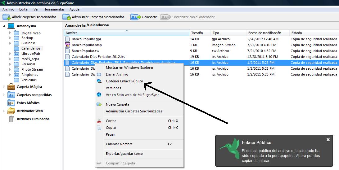 SugarSync instalado en el escritorio podemos generar un enlace público de cualquiera de los archivos que tengamos almacenados sólo dando un click derecho sobre este y seleccionando "obtener enlace público".